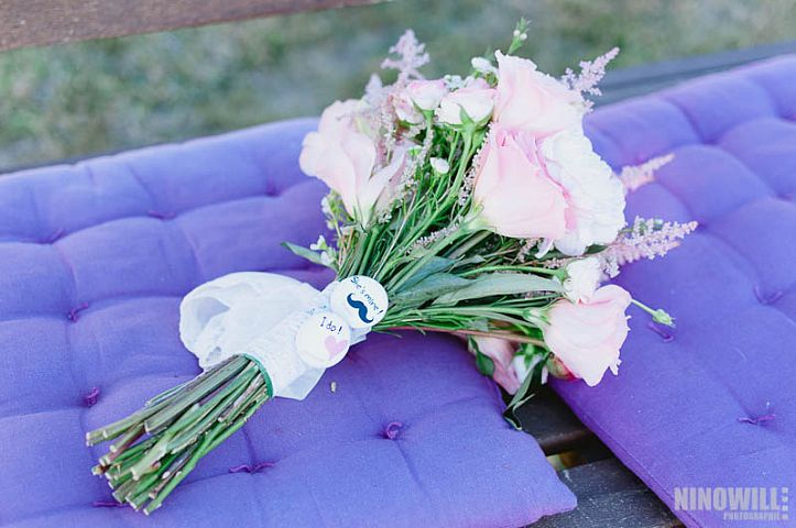 Voici donc mes badges en scène le jour J ! (G. en avait accroché à son bouquet de mariée, ça m’a touchée !)