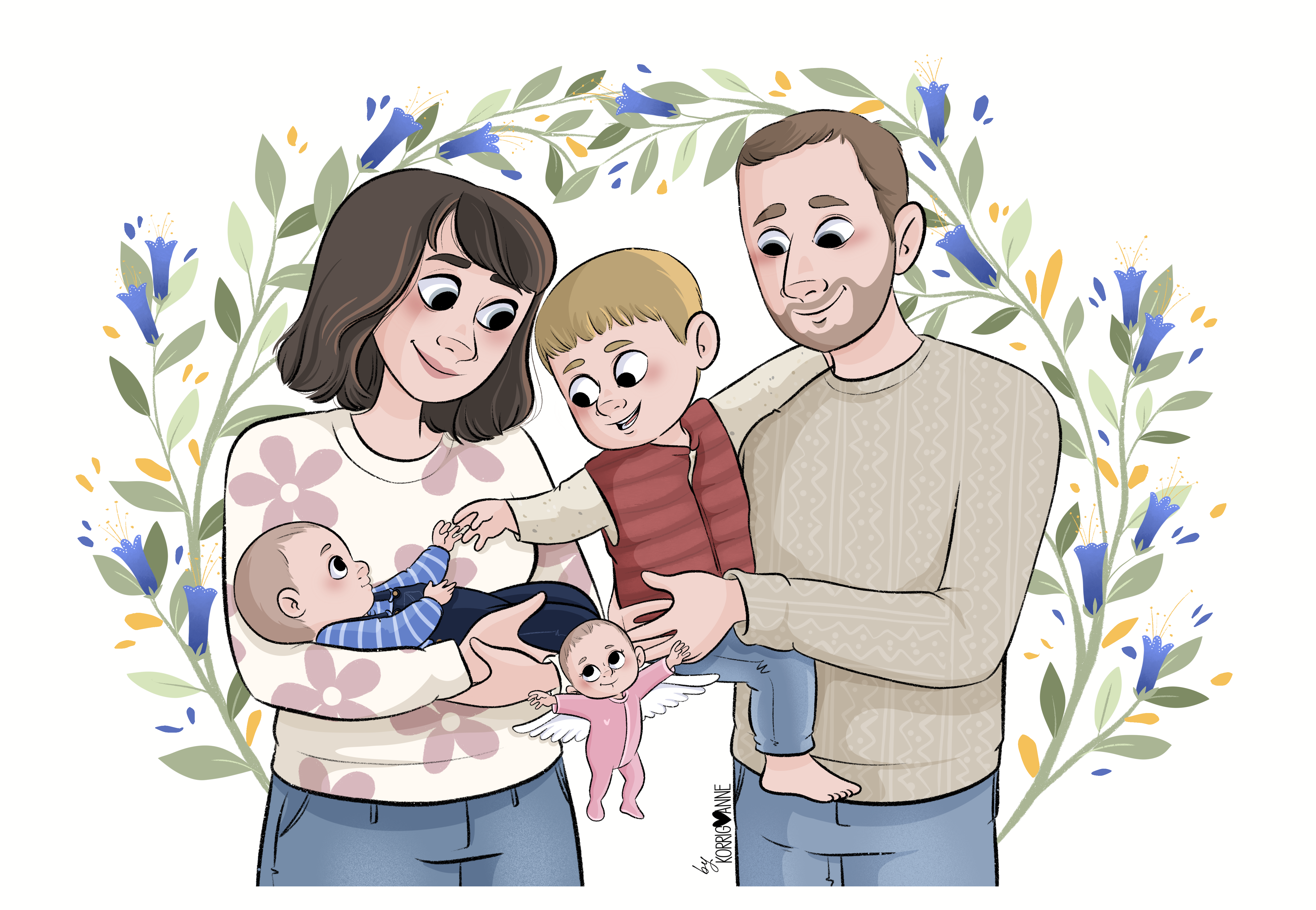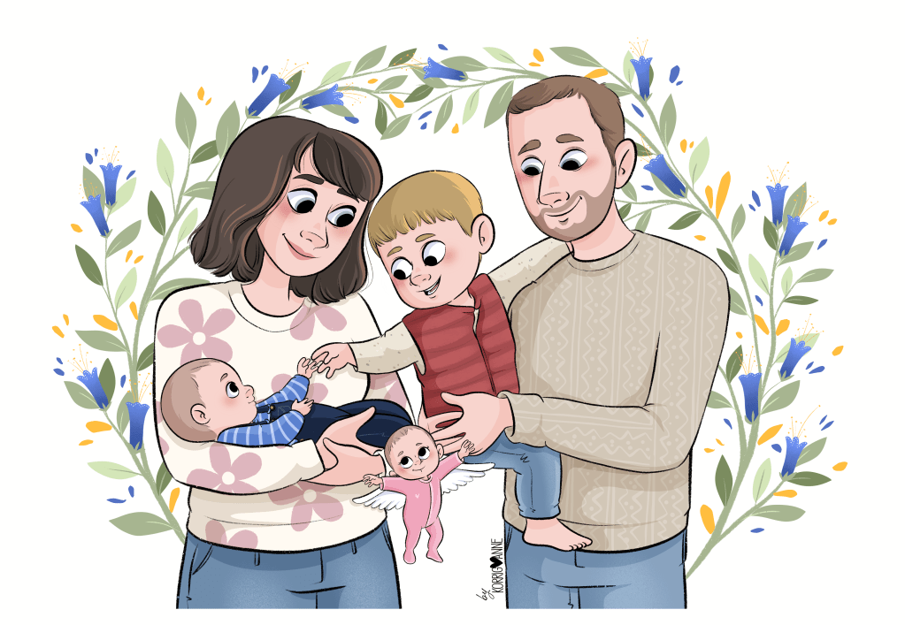 Pour dessiner leur famille, mes clients ont choisi la formule « portrait jusqu’à la taille » dans ma boutique.