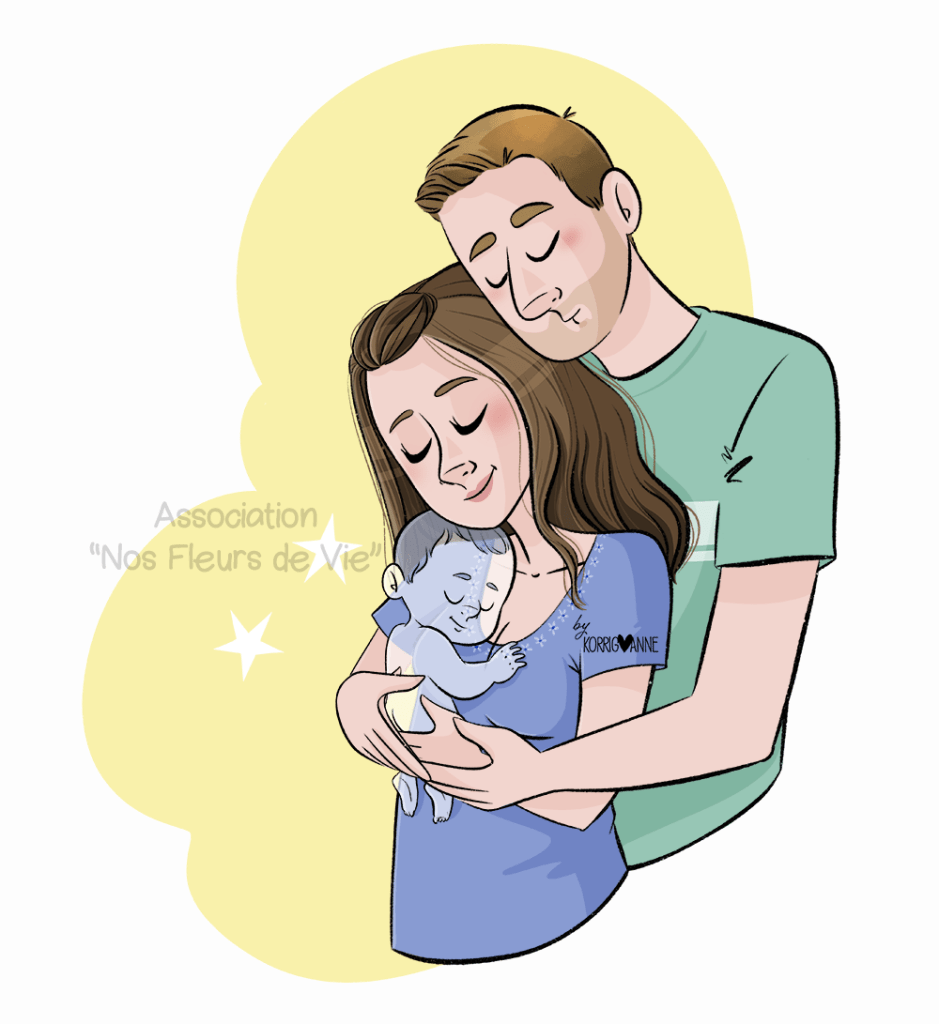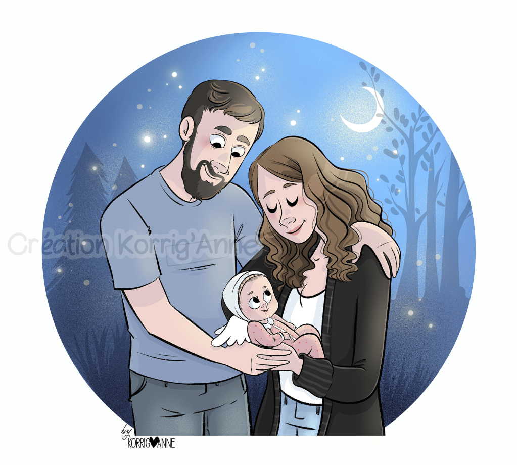 Portrait de famille pour les parents qui ont des petits bébés anges au ciel. Portrait souvenir qui les réunit en image. Je dessine pour les familles, toutes les familles. Et je réunis ceux qui s’aiment.