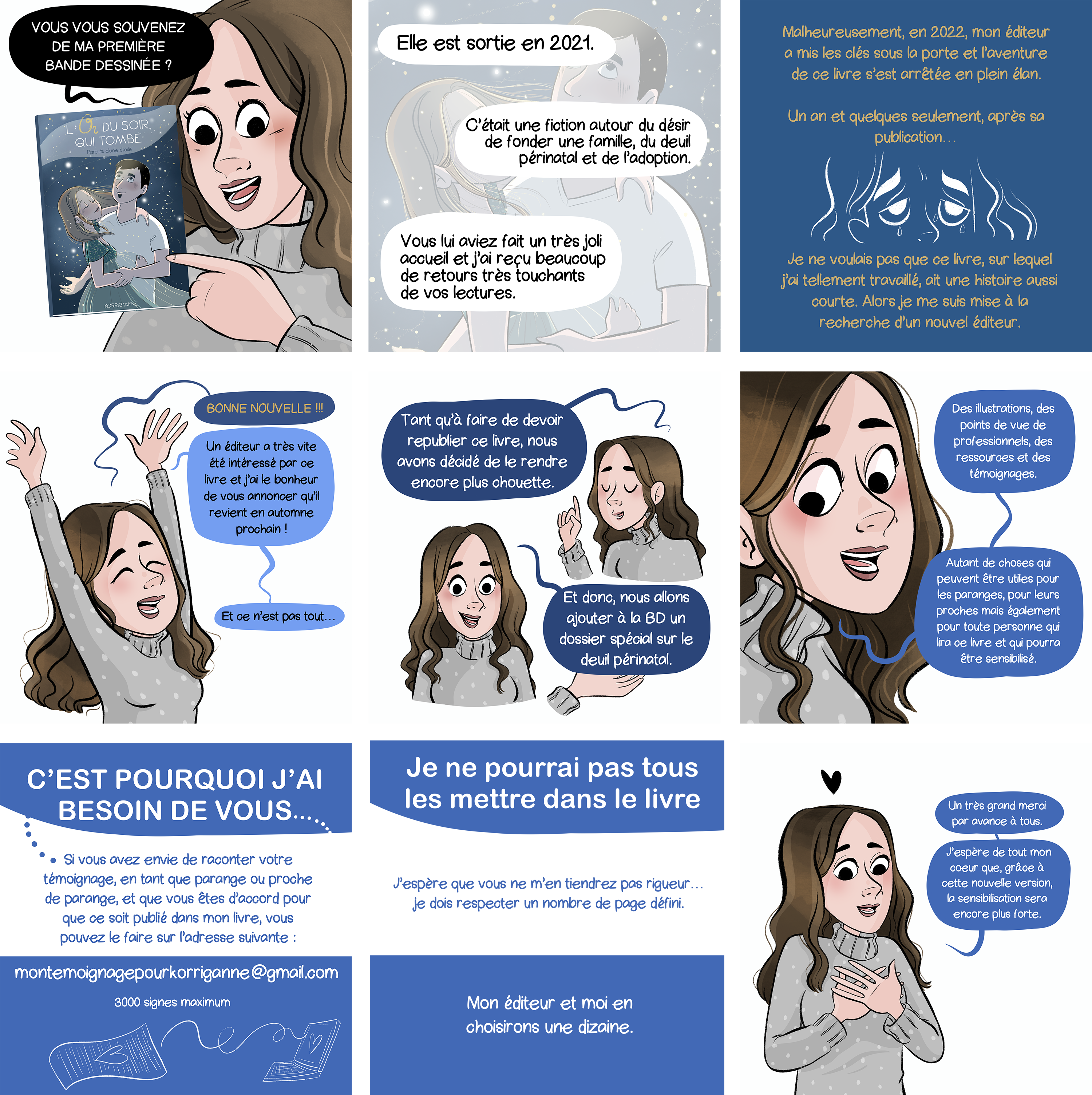 Tant qu’à faire de devoir republier ce livre, nous avons décidé de le rendre encore plus chouette. Et donc, nous allons ajouter à la BD un dossier sur le deuil périnatal. Des illustrations, des points de vue de professionnels, des ressources et des témoignages.