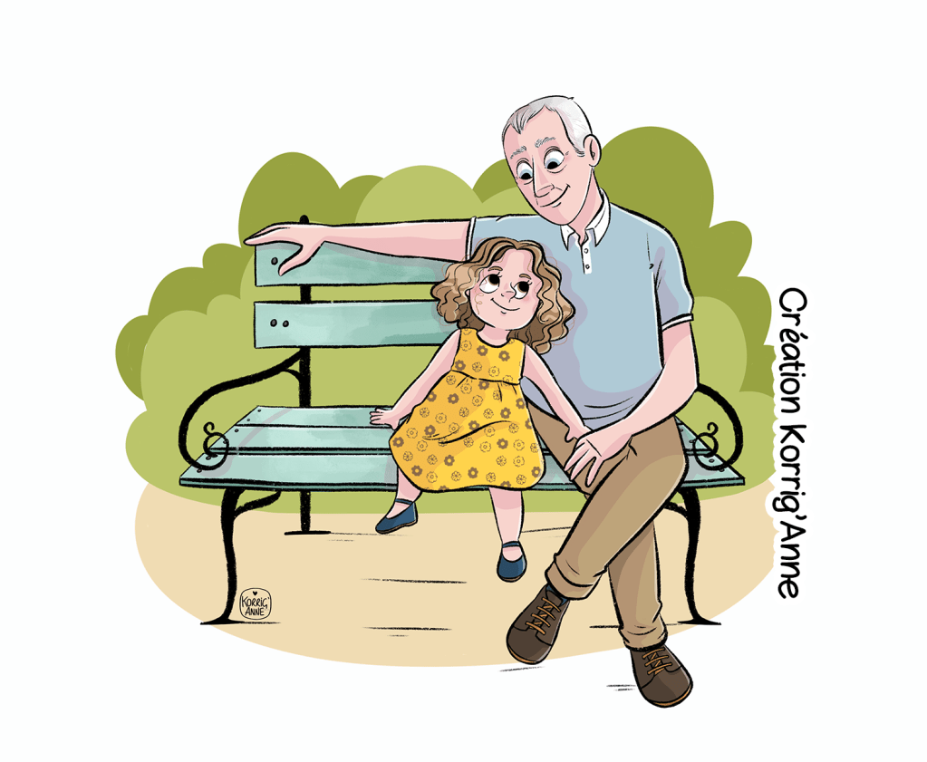 Parfois, vous me faites dessiner des scènes très précises, empreintes de moments familiaux importants à vos yeux. Comme ce papy sur un banc, qui regarde tendrement sa petite-fille 😍😍😍