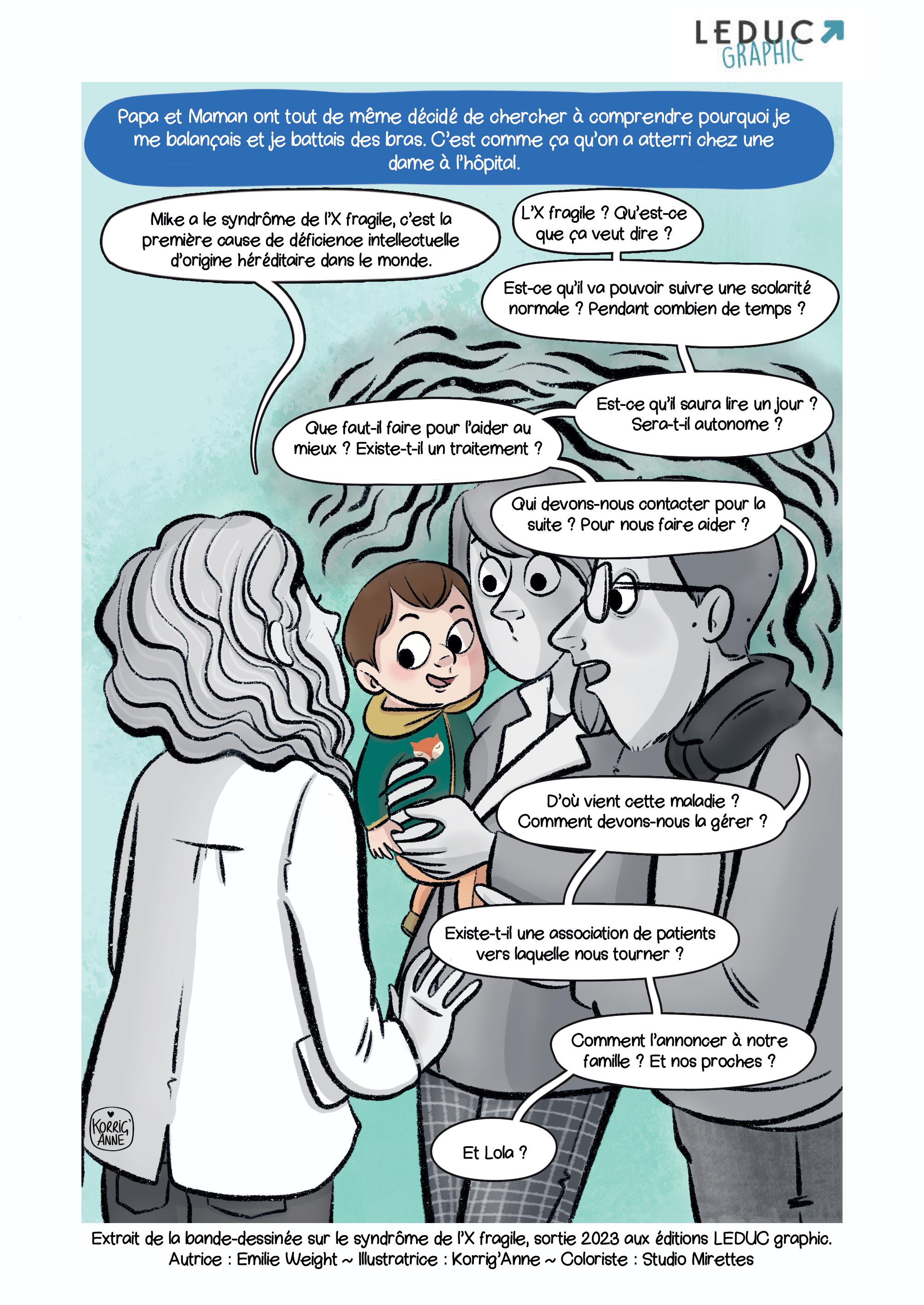 En août 2023, aux éditions LEDUC, sortira une bande-dessinée totalement dédiée à ce sujet et à cette sensibilisation. Écrite par Emilie Weight, ce sera l’histoire vraie de son fiston Mike, porteur de ce syndrome. De sa naissance à son adolescence en passant par le diagnostic, les difficultés sur le chemin, les moments tendres et incroyables, la vie de cette famille ordinaire dont un des membres est extraordinaire. Je serai les petites mains qui dessineront cette famille, ce témoignage, cette cause…