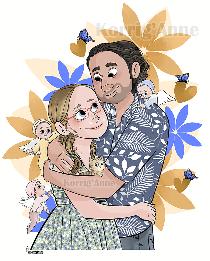 J’ai été profondément émue en découvrant ce portrait. Mon cœur se serre à l’idée que mes enfants ne pourront jamais être réunis sur une même photo. Mais ce portrait exprime avec tant de justesse ce que je ressens au fond de moi : nous sommes une famille. Au complet. Une vraie famille, unie par l’amour, la tendresse, la douceur. Ma petite princesse, partie trop tôt, y est représentée avec une fidélité bouleversante et une infinie délicatesse. Et mon petit espoir, qui grandit en moi, y trouve aussi toute sa place. Merci pour ce si beau et précieux cadeau. 🌟🤍 Sarah
