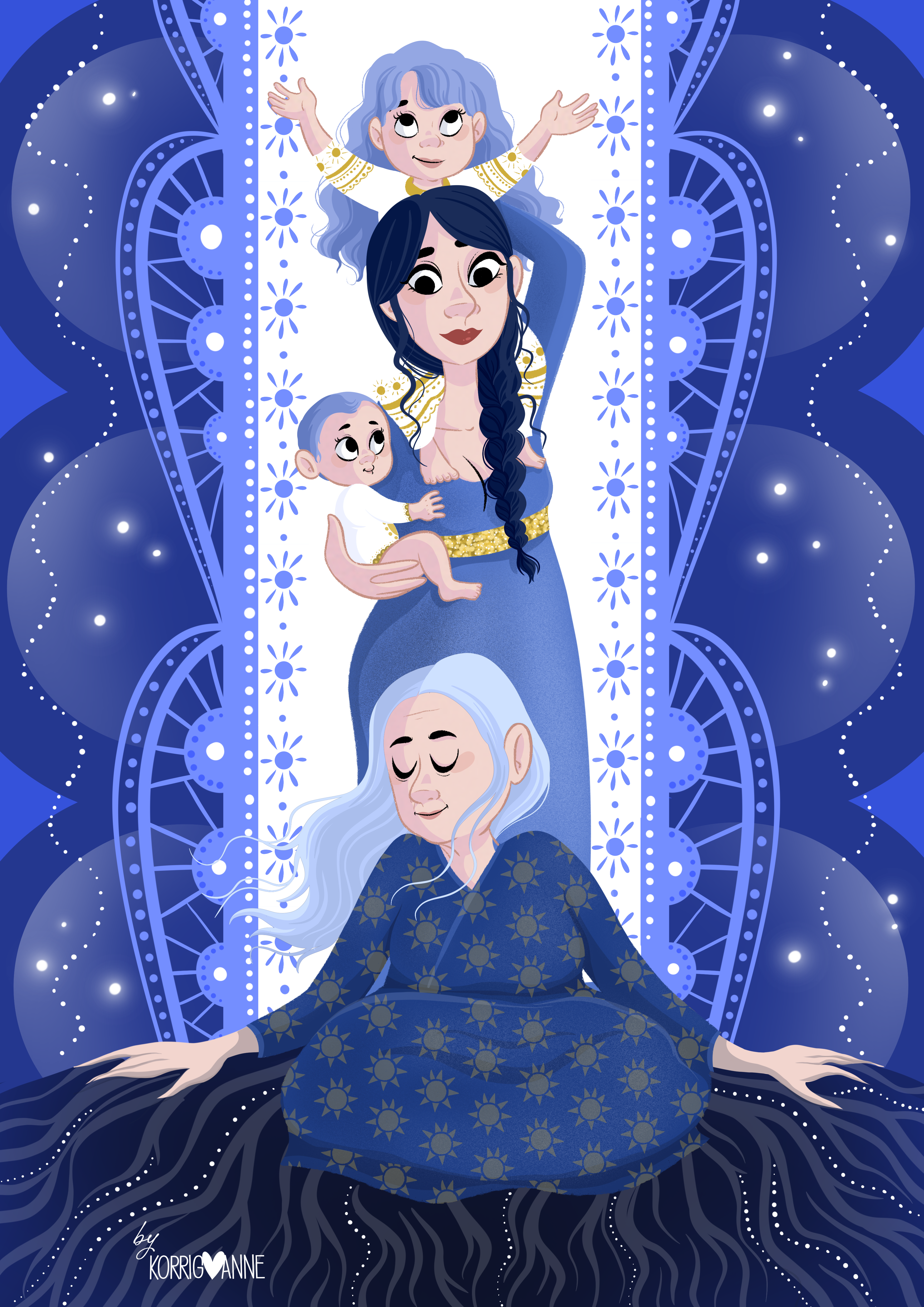 Ma première demande de portrait générationnel… comme je suis heureuse que ce format vous ait plu ! Dans l’idée d’un arbre généalogique, j’ai dessiné la lignée de cette maman. Ses parents, et elle entourée de tous ses enfants. Sa famille qui prend racine dans ses ancêtres et qui fleurit et grandit vers l’avenir.