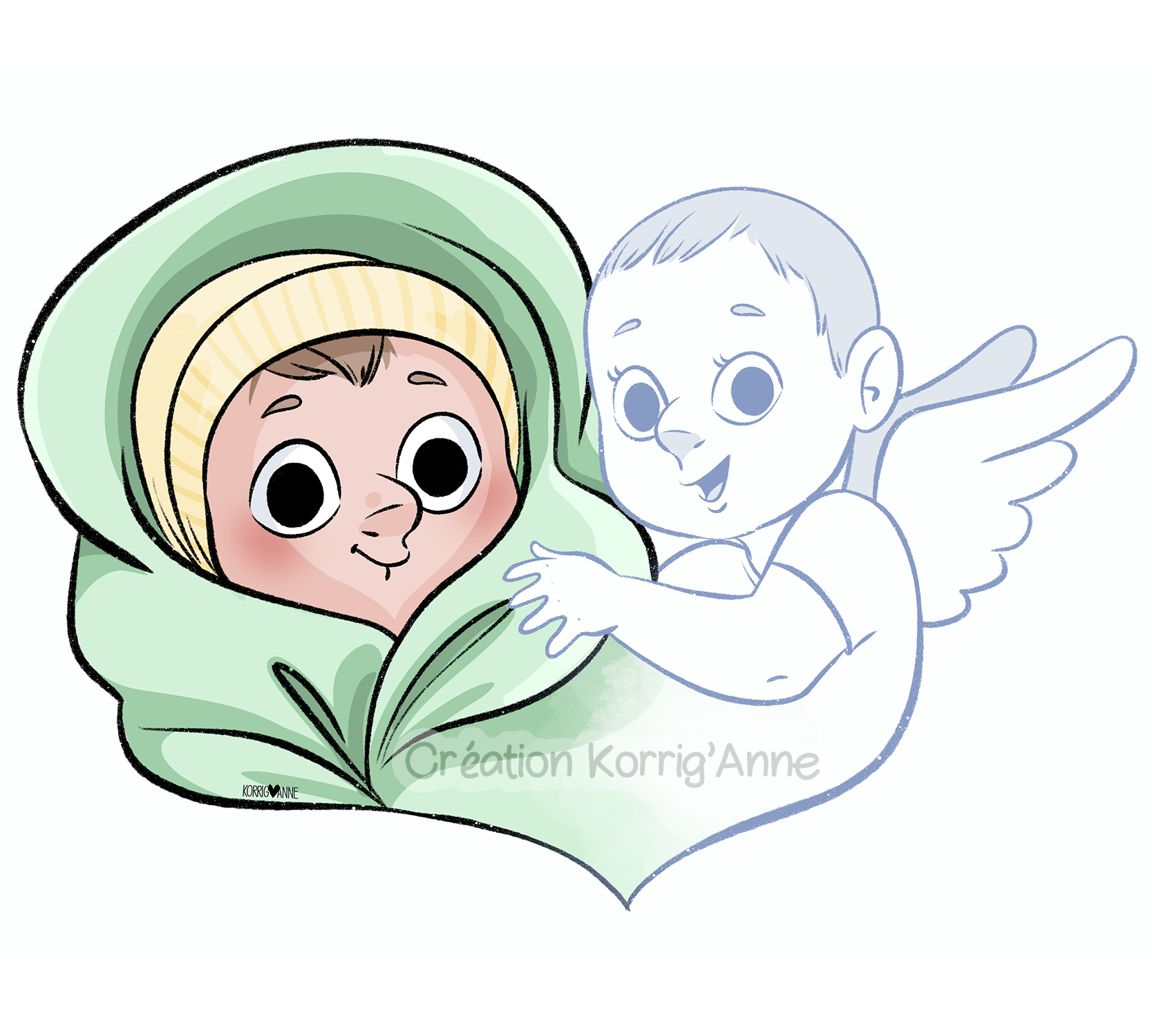 Cette illustration a été réalisée pour un livre témoignage d’une mamange. Elle parle de sa petite Aby du ciel, et notamment de son rôle de protection auprès de son petit frère arc-en-ciel. J’ai trouvé ça si beau et inspirant.
